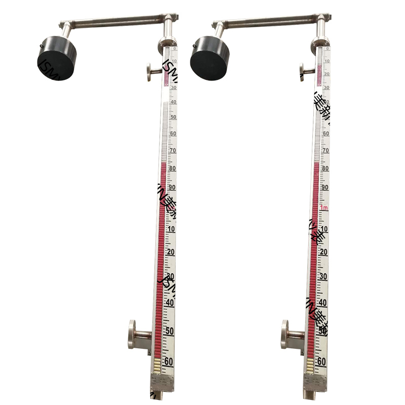 浮标液位计以浮标为测量元件,液位变化时,浮标随之上下浮动,通过与浮标软连接的牵引索带动主体立管内的重锤(内含磁钢)做反向同步移动,利用磁钢与磁翻板的磁耦合作用,驱使磁翻板翻转180°,显示器顶端为液位下限(既零位)底端为液位上限(既满量程)液位上升时,显示器以红色指示液位高度,红色下部为白色,显示无液部分(即液红气白)。随着液位的不断上升,红色不断增加由上下移,白色不断下移减少,从而显示器以红色连续的支出液位的高度。